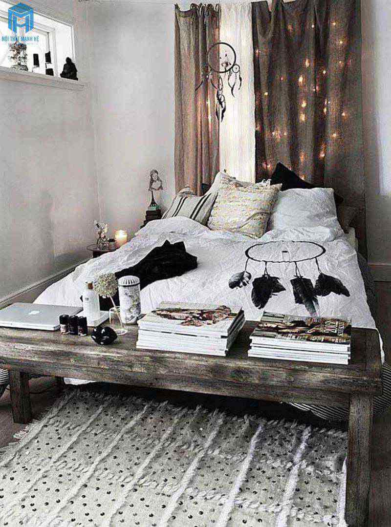 Sự biến hóa các kiểu thiết kế nội thất Bohemian đúng bản chất hoang dã, tone màu tối là sự kết hợp giữa thiên nhiên, với gỗ được sơn trắng hoặc những cành hoa nhỏ liti trên nền trắng chủ đạo rất dễ thương và sang trọng. Ngoài ra, còn điểm vài ánh đèn vàng nhỏ nhỏ ấm cúng nữa.
